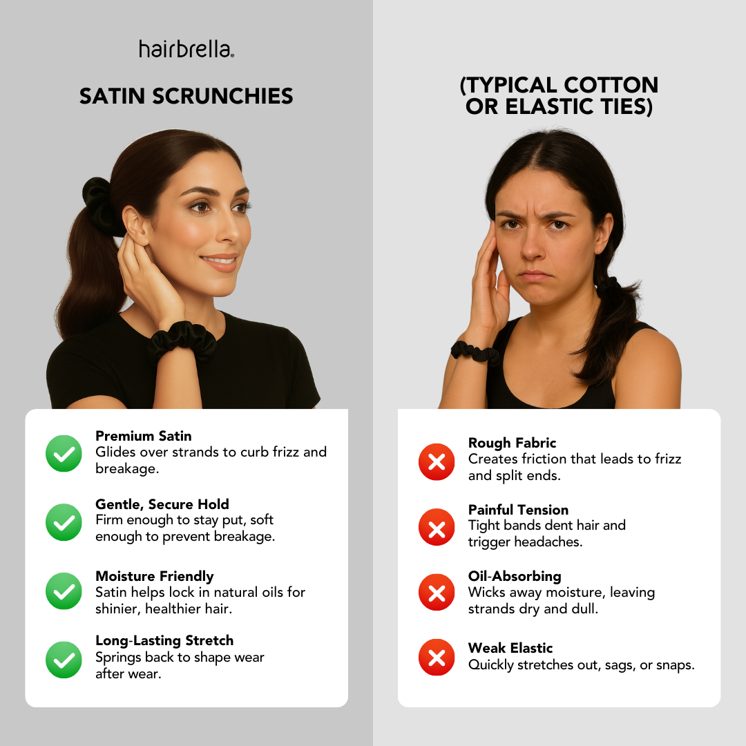 Whether you have thick, fine, curly, or straight hair, the Hairbrella Satin Scrunchies are designed to work with all hair textures, offering comfort, protection, and style for everyone.