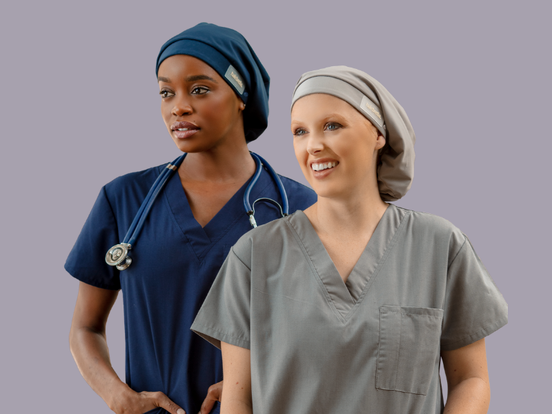 Upgrade your uniform with our satin-lined scrub caps featuring ear-relief buttons, sweatbands, and detachable and packable face shields.