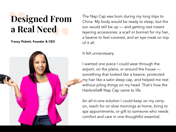The Hairbrella Nap Cap™ reimagines the traditional sleep cap with intentional design and elevated comfort. Crafted with a premium 4-way stretch satin exterior, a cooling satin-lined interior, and a discreet built-in eye mask, it helps you truly power down while keeping your hair protected.