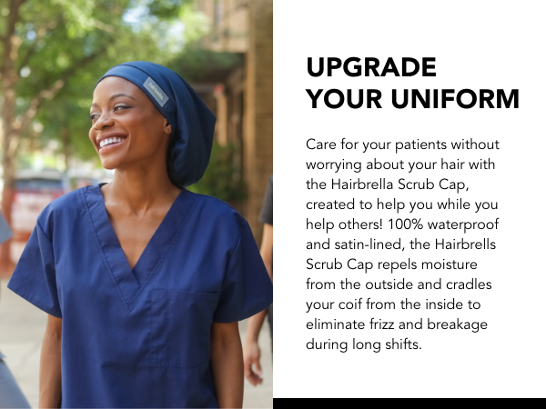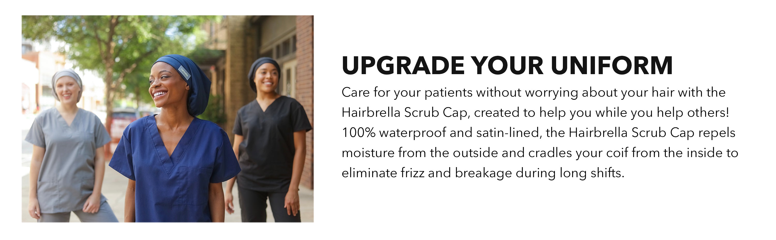 Care for your patients without worrying about your hair with the Hairbrella Scrub Cap, created to help you while you help others! Water-resistant and satin-lined, the Hairbrella Scrub Cap repels moisture from the outside and cradles your coif from the inside to eliminate frizz and breakage during long shifts.