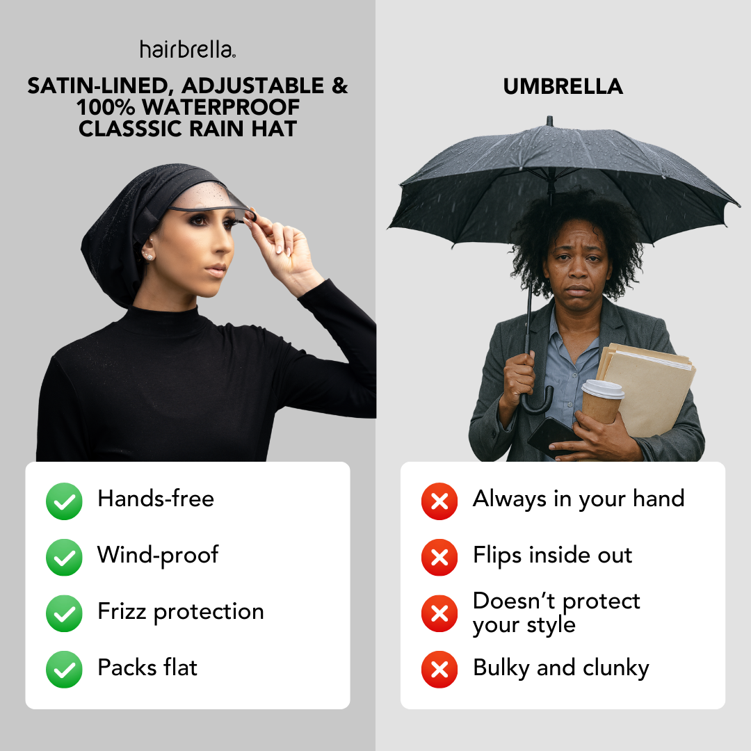 Don’t let the rain ruin your style. Grab your Hairbrella Classic Satin-Lined Rain Hat today and step out with confidence—every single time.