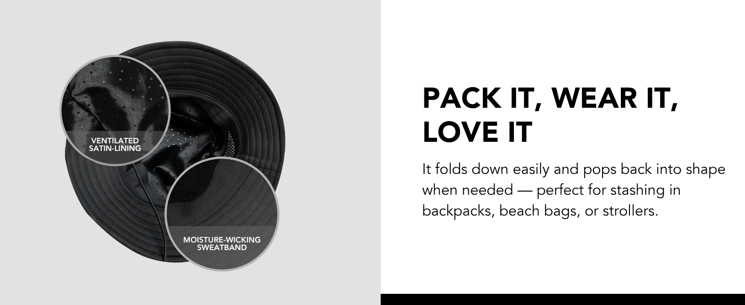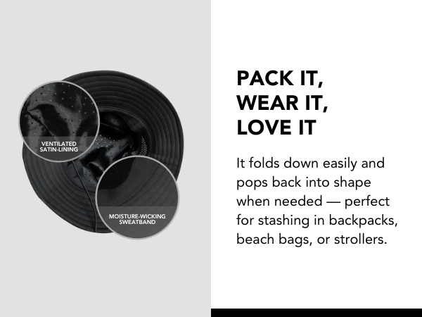 Toss it in your bag or backpack with ease. The Hairbrella Sun Hat folds flat, making it the perfect on-the-go sun solution.